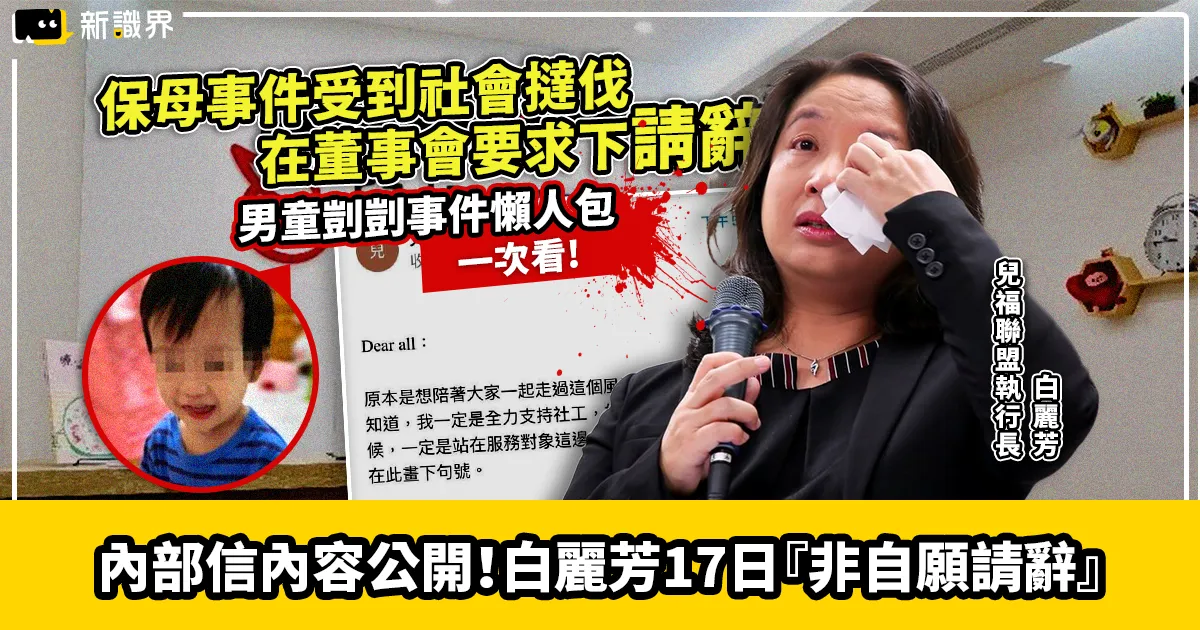 台北一名 1 歲男童被保母虐待致死剴剴事件引起社會關注。負責媒合保母的兒福聯盟受到批評,其執行長白麗芳在董事會要求下,於昨(17)日發內部信辭職。