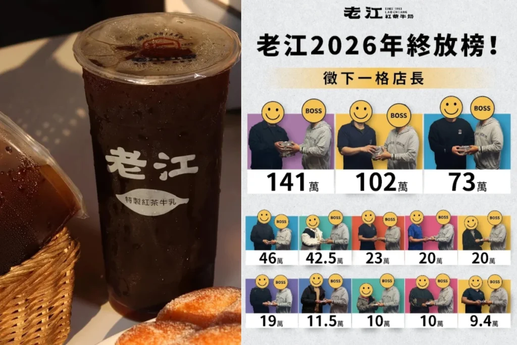 老江紅茶官網 1/27 公布 2026 老江年終榜,除了奪冠的 141 萬店長外,亞軍也領走了 102 萬元,其他門市店長則分別領到 73 萬、40 多萬不等,高額獎金羨煞許多網友,直呼:「想瞭解職缺」!