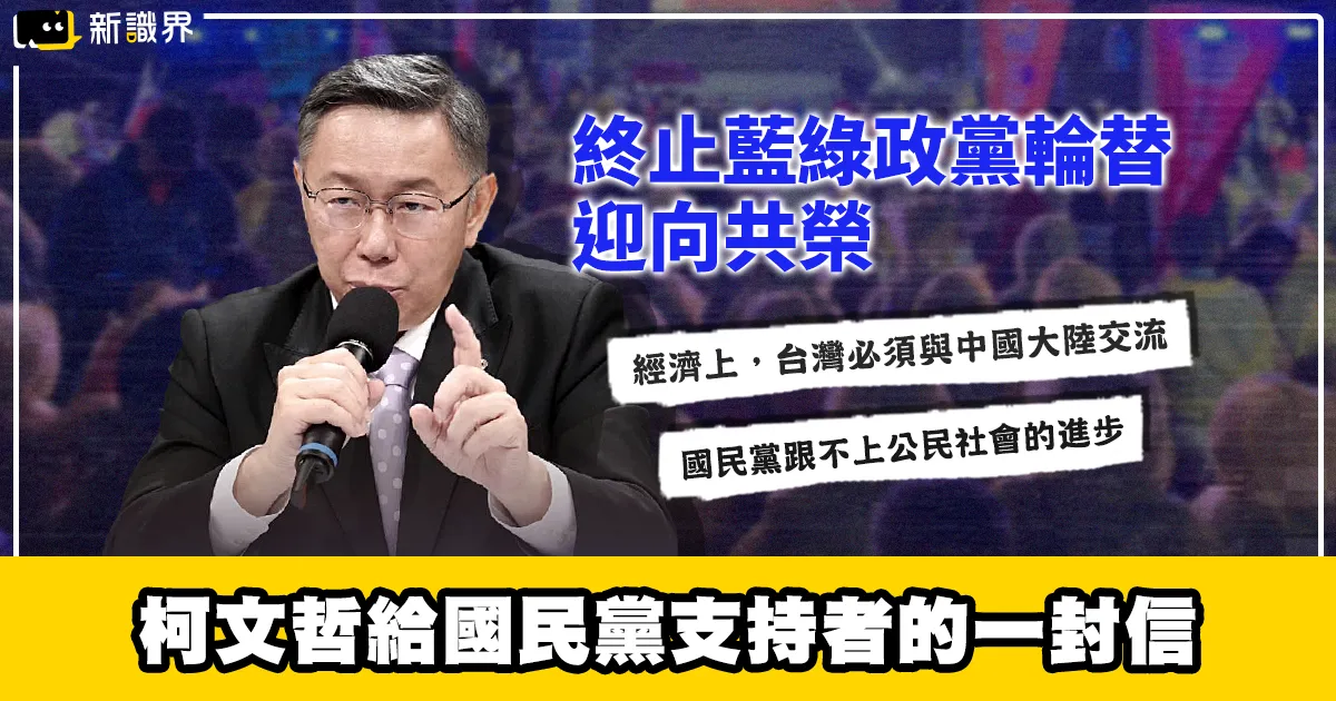 支持國民黨的朋友,您們好,我是柯文哲: 不知道大家最近是否有思考過,自己為什麼支持國民黨?是認同中華文化?對兩岸經濟有期待?或是擔心戰爭風險? 我知道支持國民黨的朋友,許多人都懷念蔣經國 前總統的十大建設,為台灣的經濟奠定穩定的根基,也懷念兩岸開放交流後的善意互動。 我認為經濟上,台灣必須與中國大陸交流、合作,促進共榮發展。 我反對文化去中化,中華文化源遠流長、五千年歷史累積的智慧,當然有我們可借鏡學習之處。別忘了,故宮是台灣重要的資產;用意識形態全面否定,無助於本土文化的深化,反之,只會製造內部的分裂。 台灣身為一個移民社會,我們應該接納與尊重各種文化,才能營造和諧進步的公民社會。 在政治上,我主張台灣要與中共保持審慎的互動,我們要記得,蔣經國先生是堅定「反共」的,我們必須堅持維護台灣的自由、民主、法治、人權。台灣與中國現階段應該秉持該合作時合作、該競爭時競爭、該對抗時對抗的自主性;台灣不能再被少數買辦集團把持,在該對抗時合作,甚至用假民調、介選等方式,破壞干預台灣的民主。 我雖然是墨綠出身,但意識形態從未干擾我對台北市的治理,我永遠思考著「什麼對台北市最好?什麼對台灣最好?」所以我無畏民進黨的抹紅,堅定舉辦八屆雙城論壇 和2017世大運。「兩岸一家親」無損國格,為的是區域的和平、穩定,人民的安居樂業。 但我仍記得,在我舉辦雙城論壇時,國民黨也有許多議員,與民進黨唱和抹紅,這是為政黨利益犧牲了國家利益,為了個人聲量而一起起鬨,這對台灣不是好的發展。 對於蔣經國前總統、與許多他帶領的專業文官為台灣奉獻,我們給予正面的肯定與評價,可惜的是新一代的國民黨在失去政權後,沒有痛定思痛、力圖革新,還是宮廷文化 、為個人權位喬來喬去,不思與時俱進。 我想請大家靜下心來思考,為什麼想投給國民黨?為的是促進政黨輪替?那麼我要告訴大家,從最近的民調看來,我已經重回第二,足以挑戰 賴清德,再讓我們更深入思考,政黨輪替的目的是甚麼?我相信你所想的,不是讓某一個政黨「上架」,而是追求一個更公義、更理想、更共融的美好台灣與聯合政府。 國民黨做得到嗎?若你也有所懷疑,請把票投給你認為最能夠帶領台灣的人。國民黨跟不上公民社會的進步,需要讓它痛定思痛,才能讓國民黨覺醒恢復健康與理想。 讓台灣重開機。