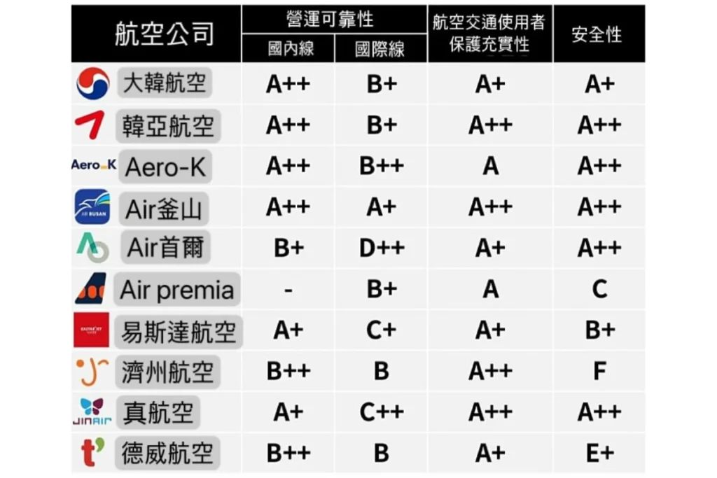 德威航空安全性略低,德威航空作為南韓市佔率極高的廉價航空,在 2025 年韓國國土交通部公告德威航空的安全性評分只有 E+